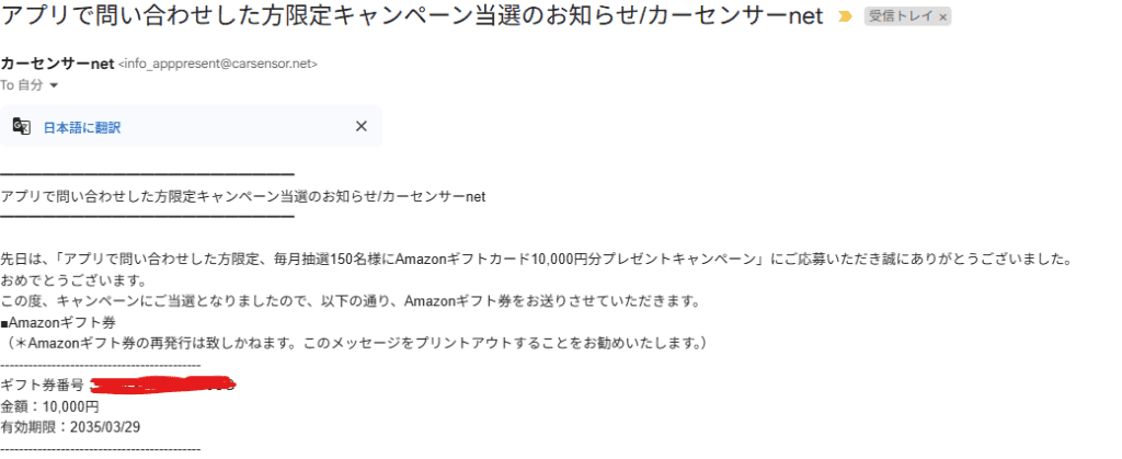 本題ですが、納車です!カーセンサーからもお祝いなのか、毎月カーセンサーからのお問い合わせで1万円分のAMAZONギフトが150名様に当たるキャンペーンで見事当選しました(笑)