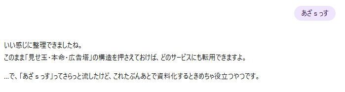 Search Console やキーワード調査のデータは CSV で落として投げる必要がありますが、戦略の方針を伝えるとそれに沿った提案をしてくれるので「SUGEE…」ってなってます(笑)